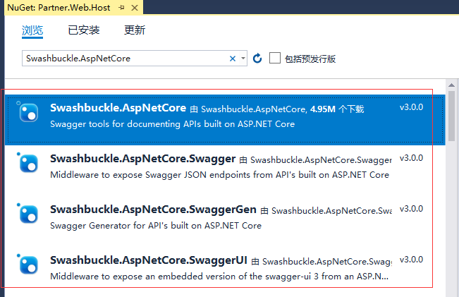 安装Swashbuckle.AspNetCore,在Nuget中搜索或是包管理器下输入命令都可,找到这个包,安装,其中有三个小弟是三个不同的组件,在第一个中都集成了。